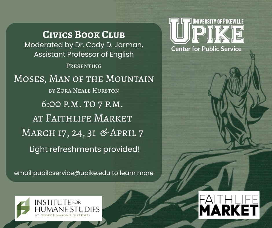 Mark your calendars for the Spring 2026 Civics Book Club meetings! Moses Man of the Mountain is a thought-provoking retelling of the Exodus story by one of America’s greatest authors, Zora Neale Hurston. Drawing on an original blend of African folklore and biblical history, the book asks timeless questions about the demands and ethics of leadership and what it takes to unite a people. Even if you know the Moses story well, Hurston forces you to see it in an exciting new light.
