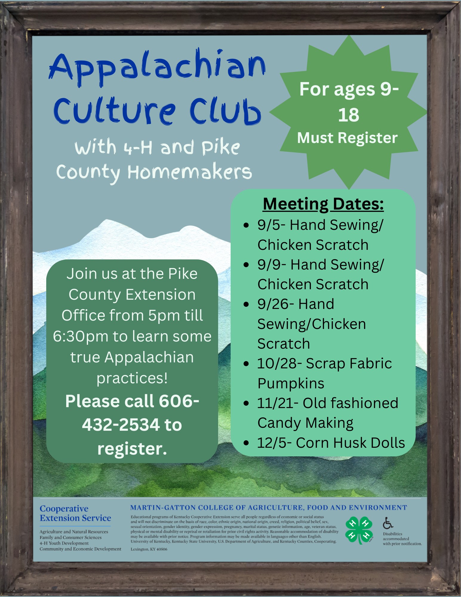 We are so excited to offer our new upcoming program! Looking for a great afterschool club that focuses on keeping our Appalachian culture alive? A club where you can learn how to make chicken scratch, authentic homemade candy, corn husk dolls, and more?? Look no further! Pike County 4-H is partnering with the Pike County Homemakers for our new Appalachian Culture Club! This club will be targeted towards ages 9-18. Spots are limited, so please call the Pike County Extension Office to register!