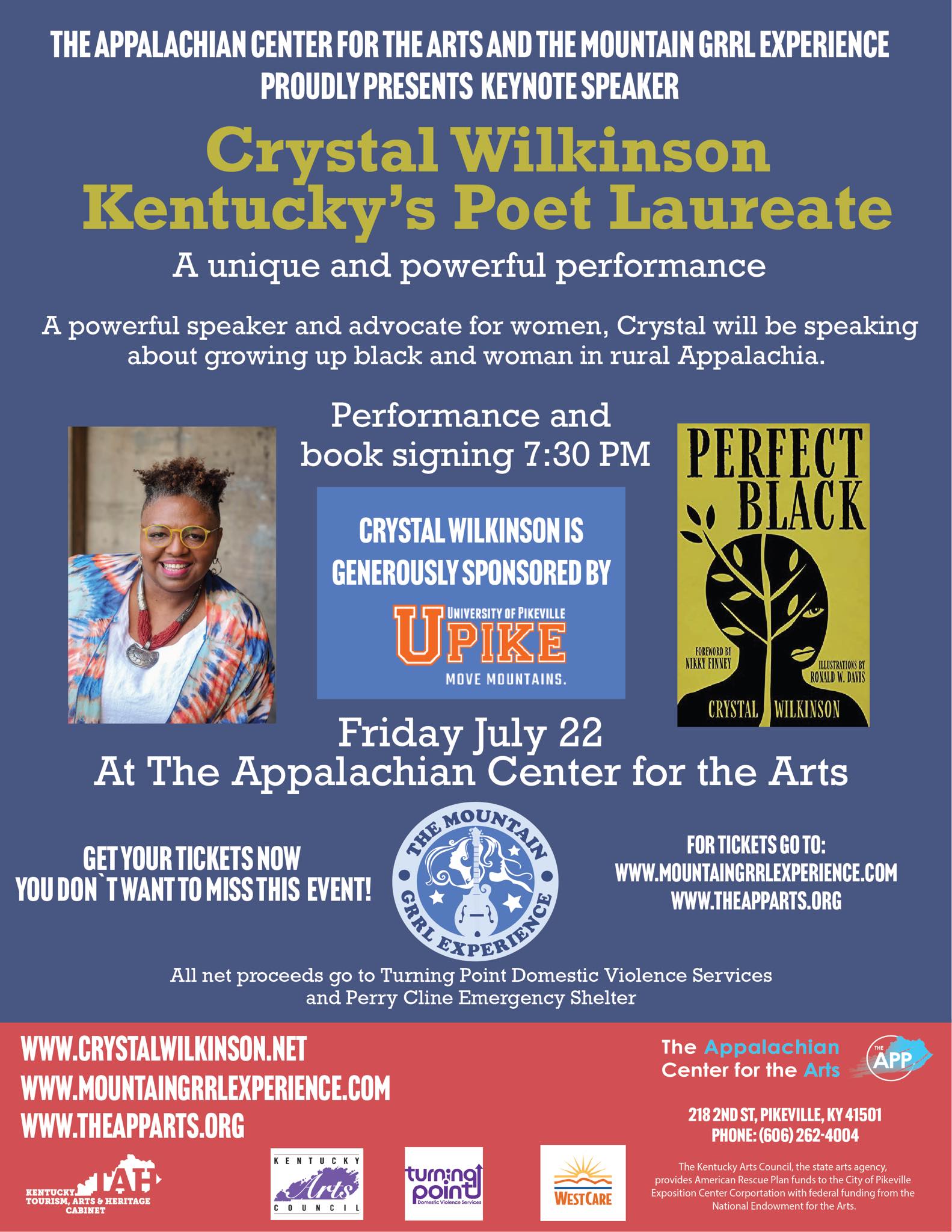 The Appalachian Center for the Arts and the Mountain Grrl Experience is proud to present Crystal Wilkinson Kentucky Poet Laureate book signing and performance July 22 at 7:30 pm