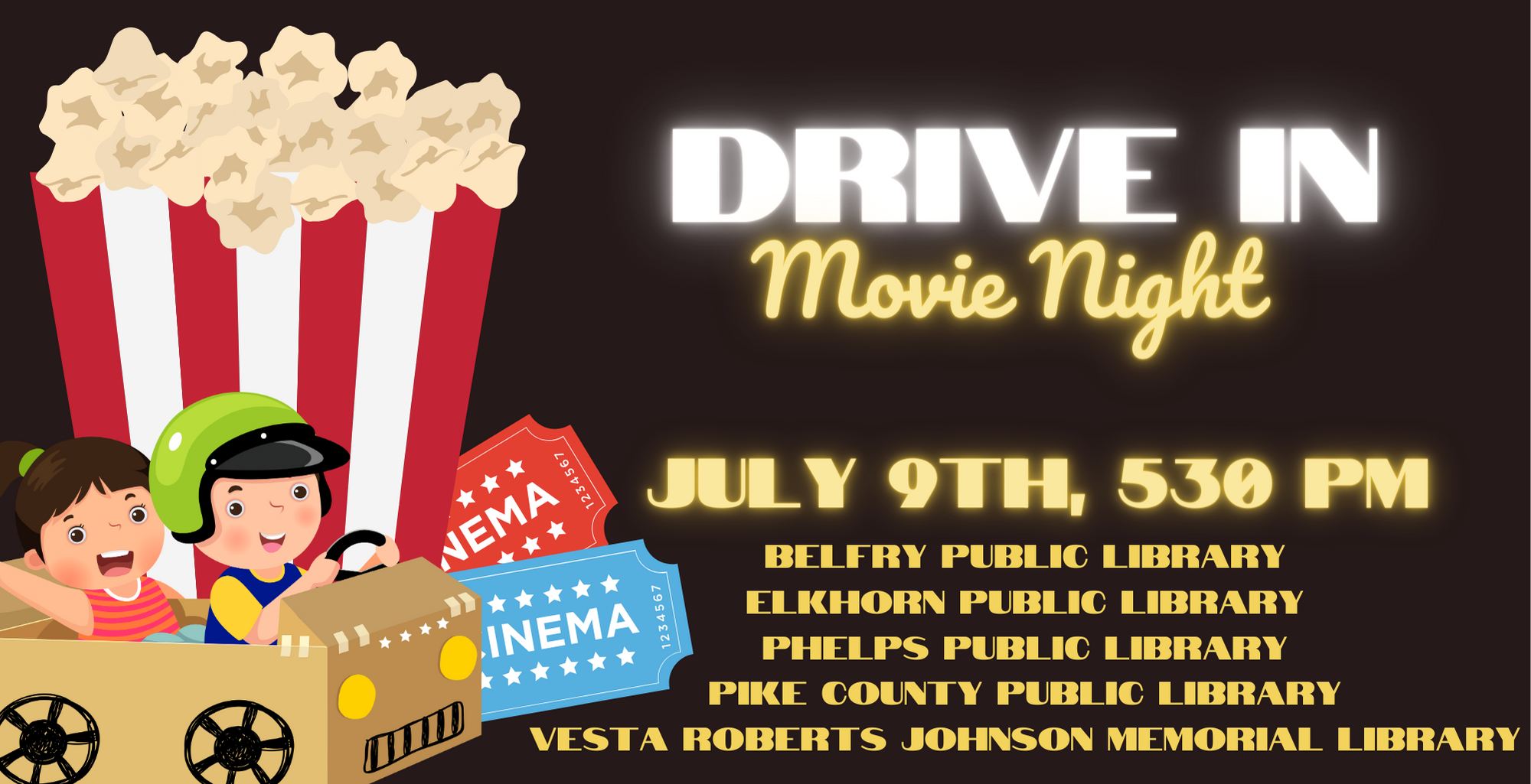 Decorate a cardboard car and enjoy popcorn and a movie at our Drive-In Movie Night! This program will be held on Tuesday, July 9th at 5:30 at the Pike County Public Library (Lee Avenue), Belfry Public Library, Elkhorn City Public Library, Phelps Public Library, and Vesta Roberts Johnson Memorial Library. No registration is required.