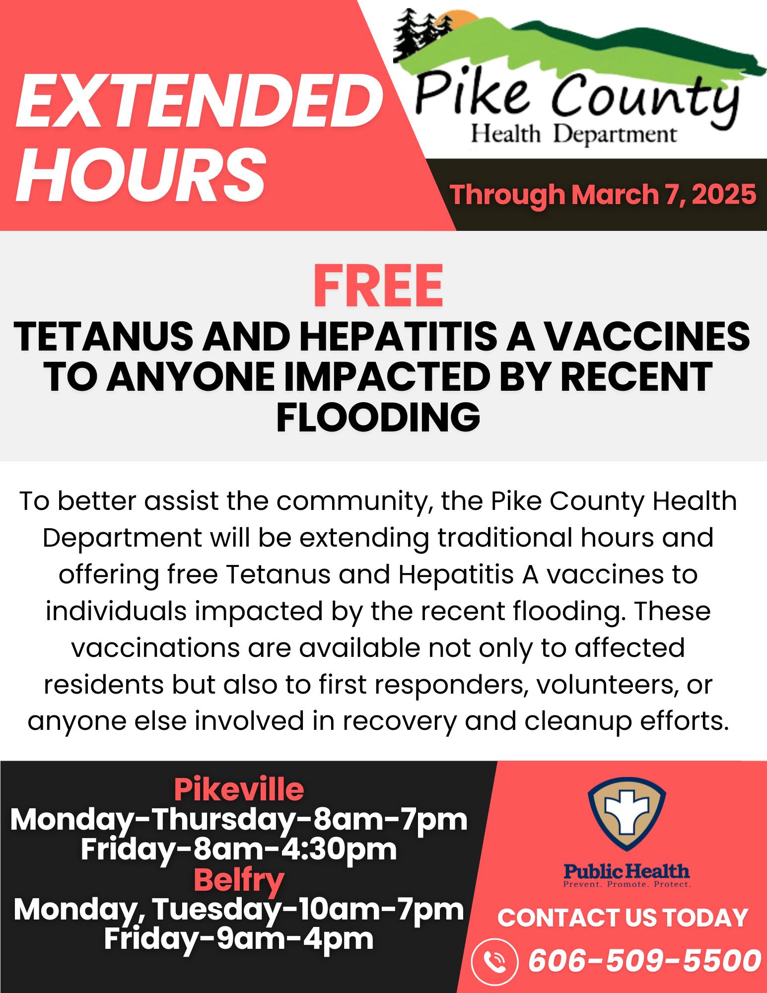 The Pike County Health Department locations, Pikeville and Belfry, will have extended hours through March 7th for vaccination services. Belfry location will also provide services tomorrow, February 27, 2025, from 9:00 am to 4:00 pm.