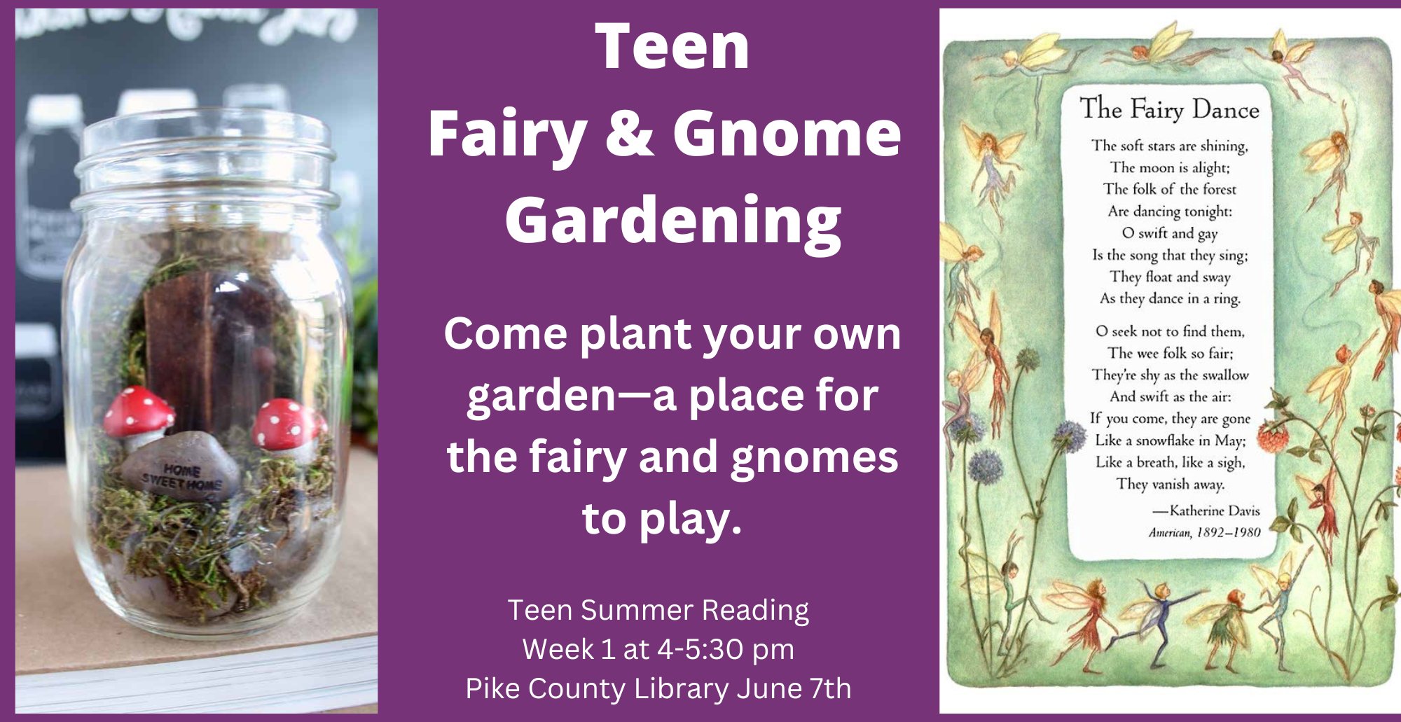 Craft a fairy/gnome garden terrarium at the Pike County Public Library (Lee Avenue) on Wednesday, June 7th at 4:30. This program is for ages 12-18 as part of our Summer Reading Program.