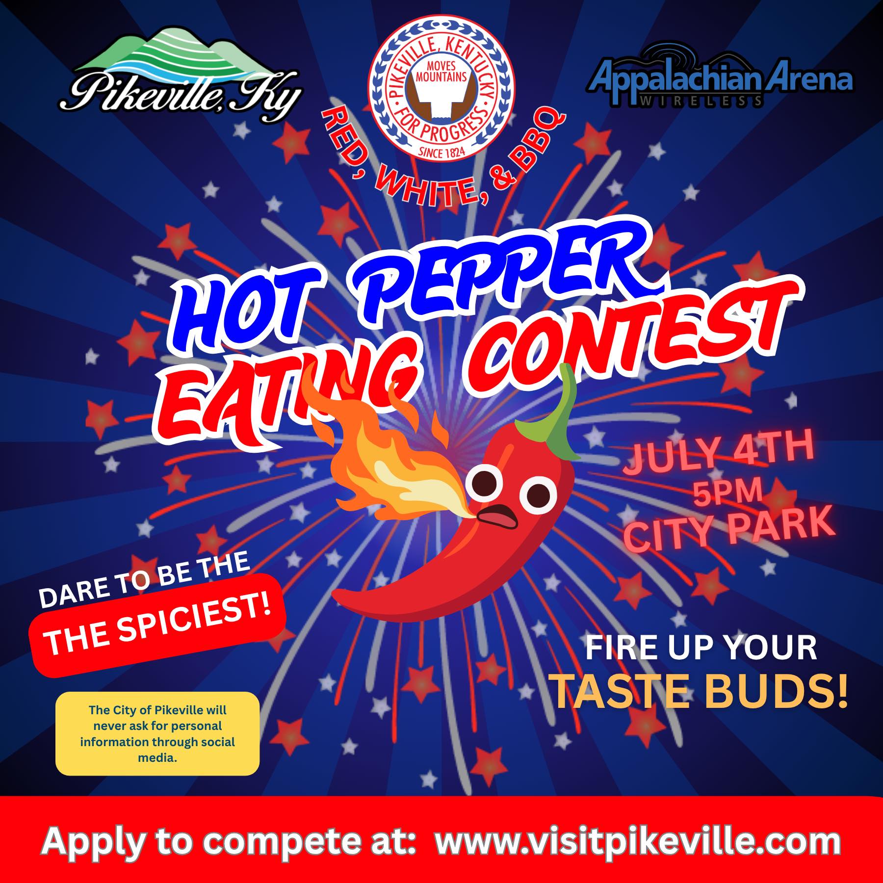 Don’t just watch the fireworks, be the fire! #VisitPikeville #HotPepperContest #RedWhiteAndBBQ #July4th #DareToBeSpiciest #CityOfPikeville #AppalachianWirelessArena