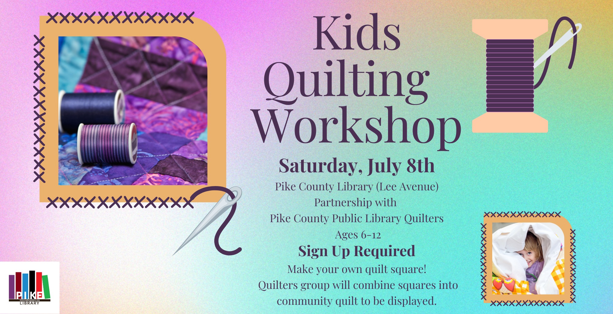 The Pike County Library Quilters Group will lead children (ages 6-12) in making their own quilt square. The Quilters Group will combine squares into a community quilt to be displayed.