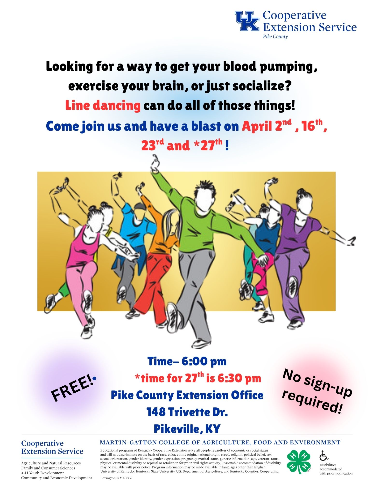 April’s Line Dancing dates have been set. Come and join us for this great way to exercise and socialize!