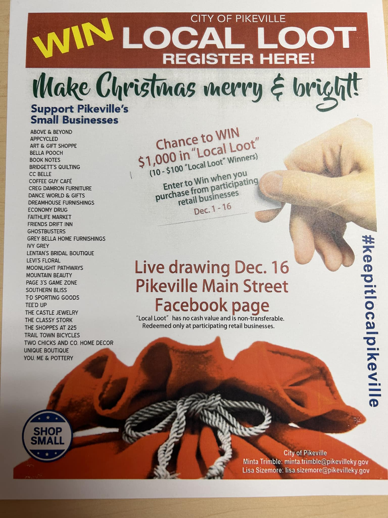LOCAL LOOT is going on now through this FRIDAY 12/16. We will be drawing out TEN—-$100 “Local Loot” Winners on Friday, Dec.16th in the City Park that evening. Easy way to WIN! See the participating Small Business list on the picture below. As always… SHOP LOCAL!