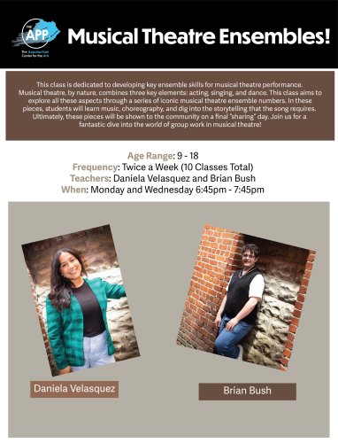 This class aims to explore all these aspects through a series of iconic musical theatre ensemble numbers. In these pieces, students will learn music, choreography, and dig into the storytelling that the song requires. Ultimately, these pieces will be shown to the community on a final “sharing” day.