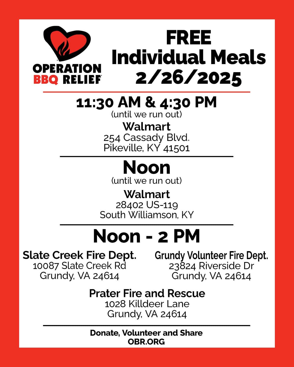 The state of Virginia will be distributing Operation BBQ Relief meals at the following locations: