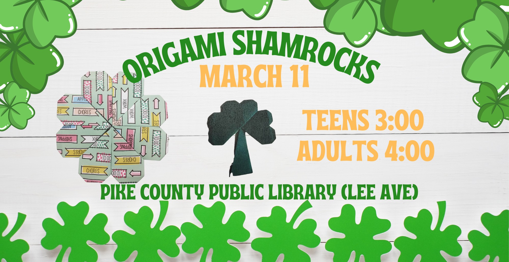 Fold origami shamrocks and four leaf clovers for St. Patrick’s Day at the Pike County Public Library (Lee Avenue) on Saturday, March 11th. A session for teens will be held at 3:00 and a session for adults will be held at 4:00. Both sessions will be in the Teen Room on the second flood of the library. Space is limited, please call the library to register. 437-6001.