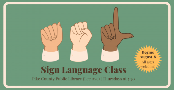 Learn American Sign Language with interpreter Tracy Jackson, with classes held every Thursday at 5:30 at the Pike County Public Library (Lee Avenue). Suitable for all ages. No registration required.