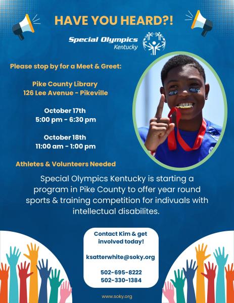 Athletes and Volunteers Needed! Special Olympics Kentucky is starting a program in Pike County to offer year-round sports and training competition for individuals with intellectual disabilities.