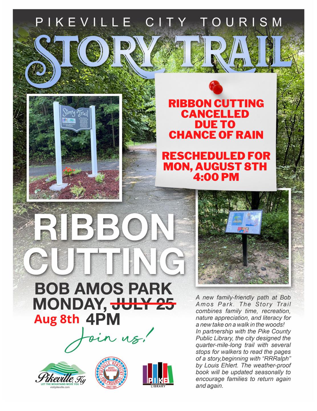 The City of Pikeville will host a public ribbon cutting for the Story Trail on Monday, July 25th at 4pm, weather permitting. The event will offer snow cones, balloons, and a free book.