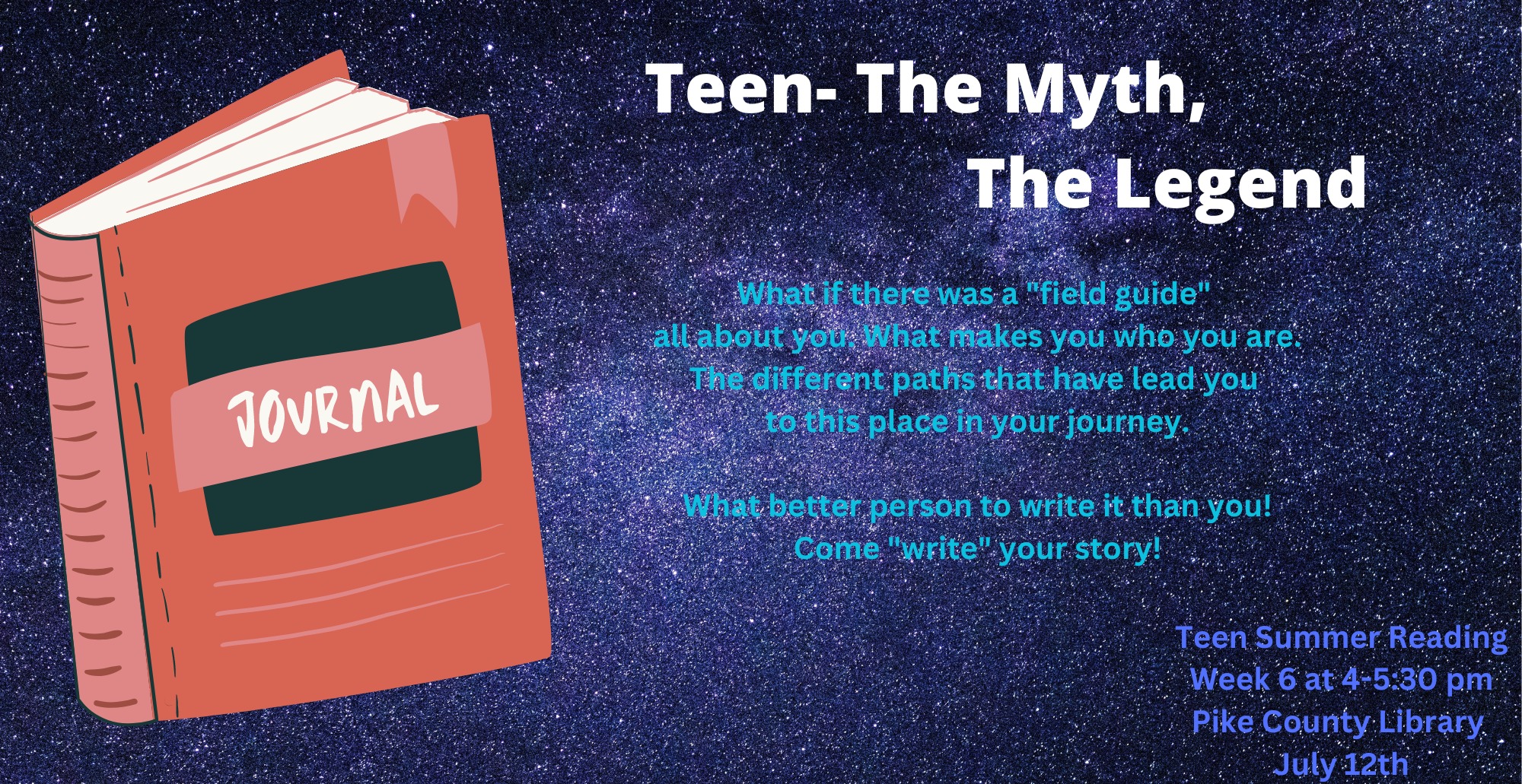 What better person to write it than you! Come “write” your story at the Teen Program: The Myth, the Legend. This program, for ages 12-18, will be held on July 12th at 4:00 at the Pike County Public Library (Lee Avenue).