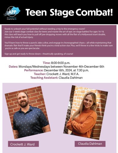 Ready to unleash your full potential without needing a trip to the emergency room? Join our 5-week stage combat class for teens and master the art of epic on-stage battles! For ages 16-18, this class will teach you how to pull off jaw-dropping moves with all the flair of a Hollywood stunt double, minus the risk of actual injury.