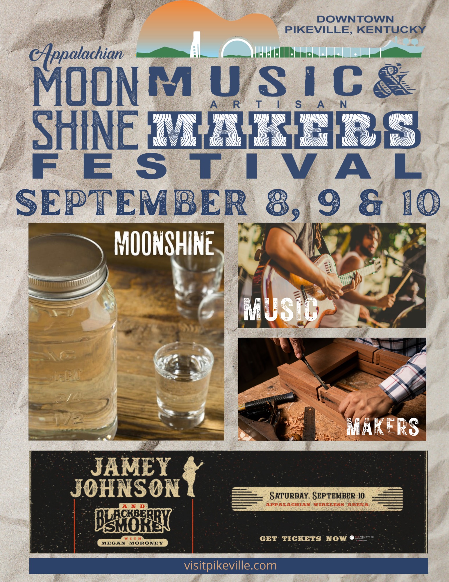 The Appalachian Moonshine, Music & Makers Festival will take place September 8, 9 & 10, 2022 in downtown Pikeville. Inspired by our shared Appalachian heritage, the Moonshine, Music and Makers Festival brings together the best in live performances, visual artists, food and beverages from across our region to celebrate the timelessness and beauty of the mountains we call home.