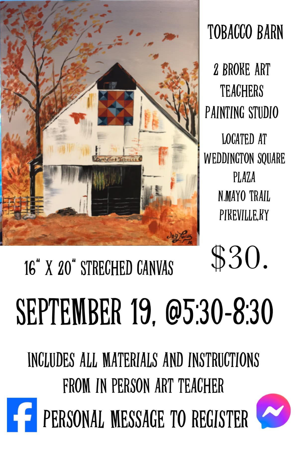 Love this barn painting. Has all the traditional elements about our farms, quilt pattern and look inside at the tobacco. Don’t let this one pass you by. Step by step instructions given as you paint. Sign up with a private message on Facebook messenger.