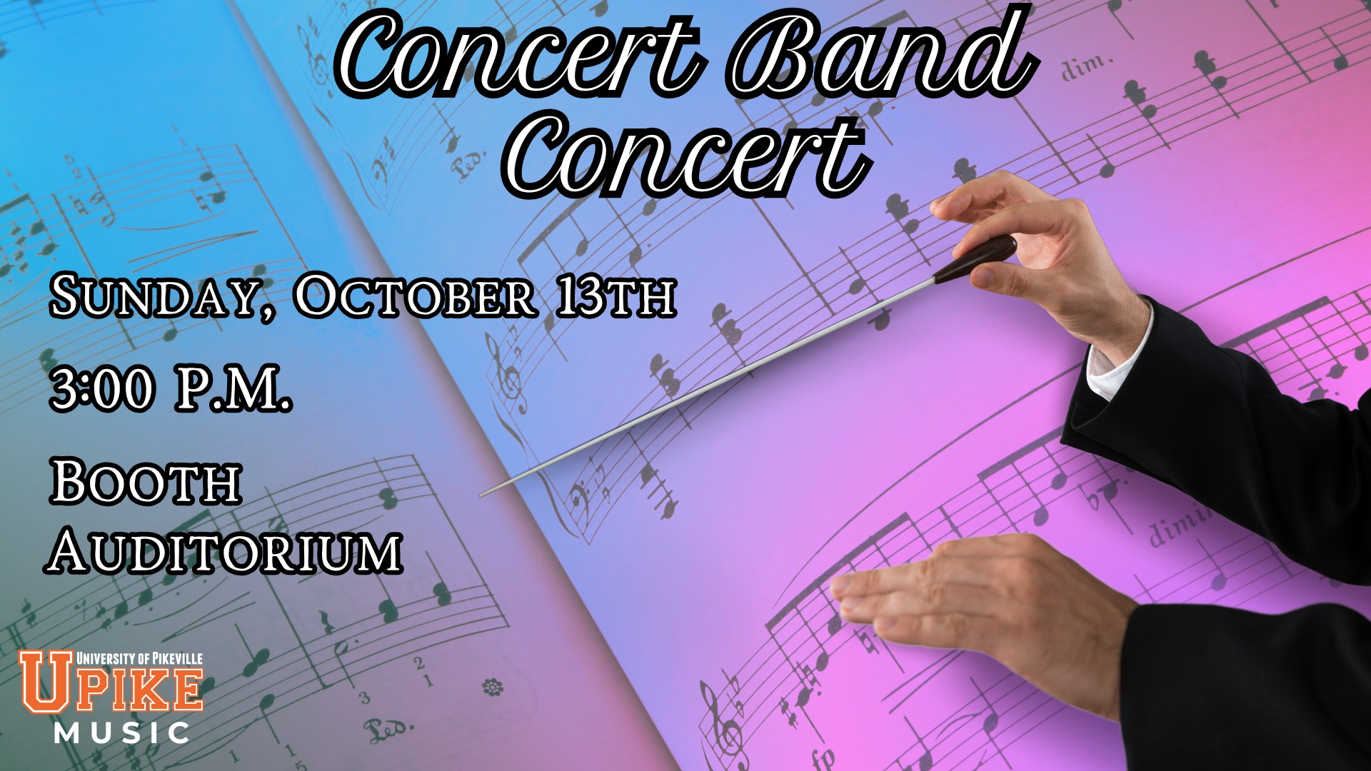 UPIKE Music is proud to present the second installment of the 2024-2025 concert season, the UPIKE Concert Band Concert. Under the direction of Professor Slade Presley Denman, the UPIKE Concert Band will be performing a series of pieces that highlight the prestige, dedication, and sense of tradition that the UPIKE Concert Band strives to achieve with every performance. All are welcome to come out and enjoy an afternoon of great music!