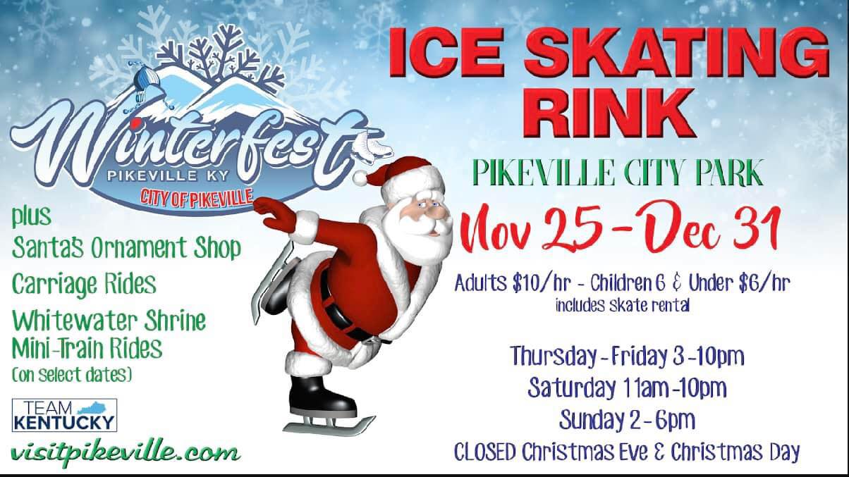 Ice Skating Rink, plus Santa’s Ornament Shop, Carriage Rides, Whitewater Shrine, Mini Train Rides (on select dates).