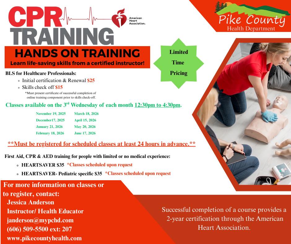 CPR training gives you the skills and confidence to respond in an emergency when it matters most. Register for our upcoming CPR classes today.To register, call 606-509-5500 or email Jessica Anderson at janderson@mypchd.com.