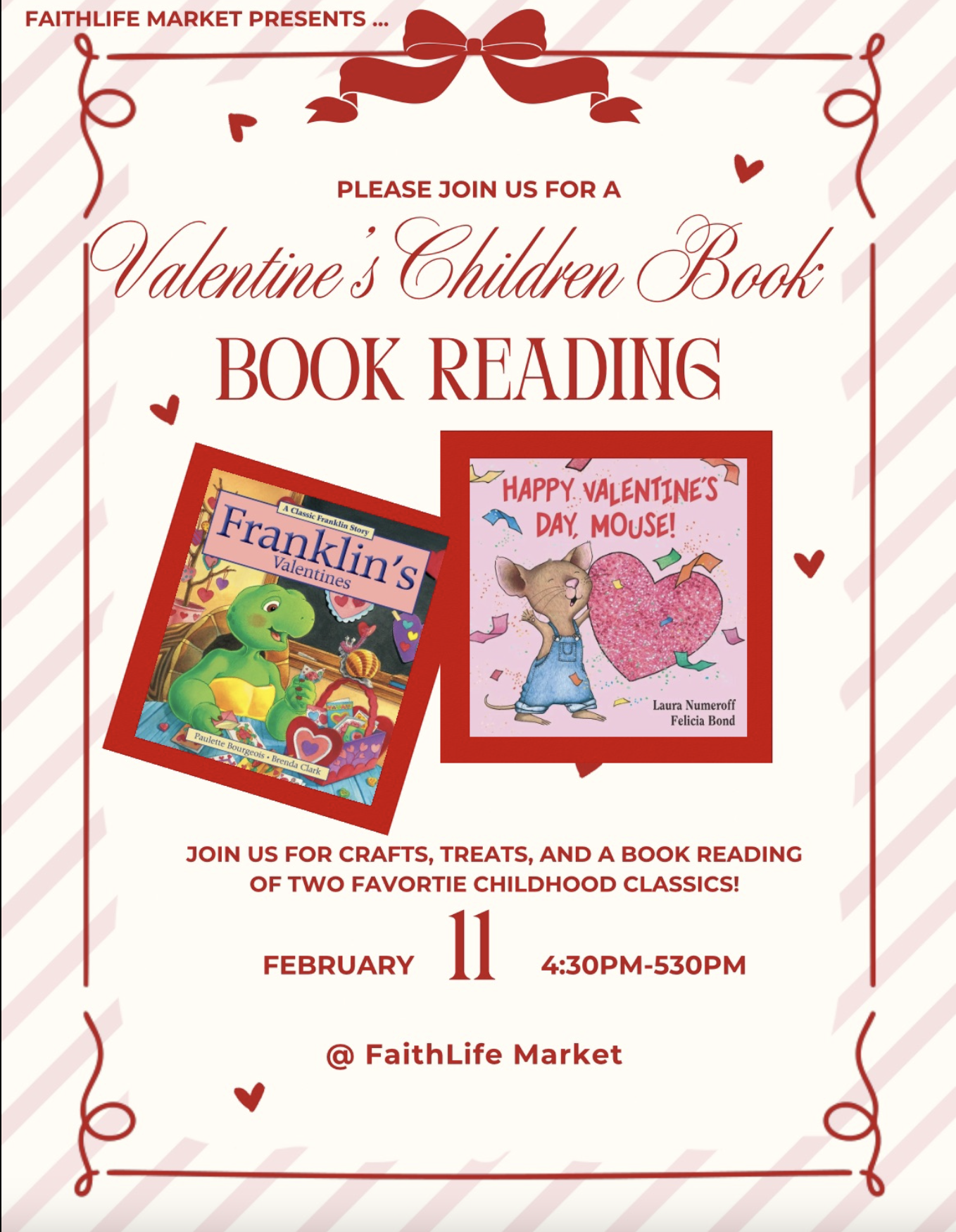 Join us for a fun afternoon of book reading, crafts, and snacks! We'll be reading two Valentine’s Day childhood favorites: Franklin’s Valentines and Happy Valentine’s Day Mouse! |