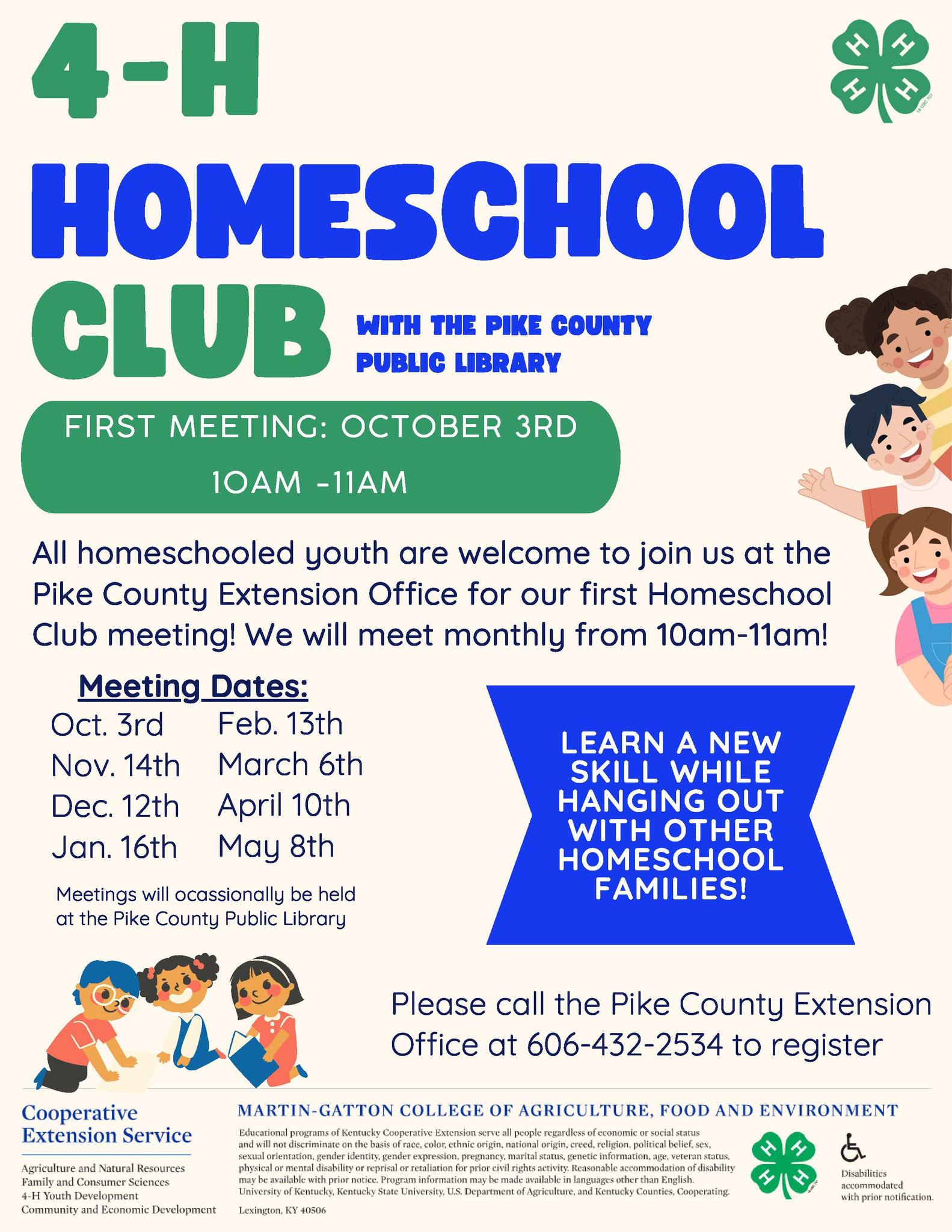 We are teaming up with Pike County Libraries to offer a new 4-H Homeschool Club! Join us for our first meeting at the Pike County Extension Office on October 3rd from 10-11. Please call us at 432-2534 to register.