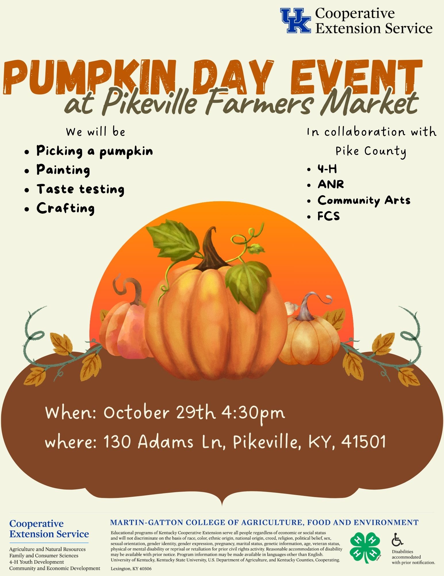 Join us for Pumpkin Day at the Pikeville Farmers Market! Come out for a fun-filled fall event with activities for all ages! We'll have: Pumpkin picking Painting Taste testing Crafting This event is hosted in collaboration with Pike County 4-H, ANR, Community Arts, and FCS. … Read More