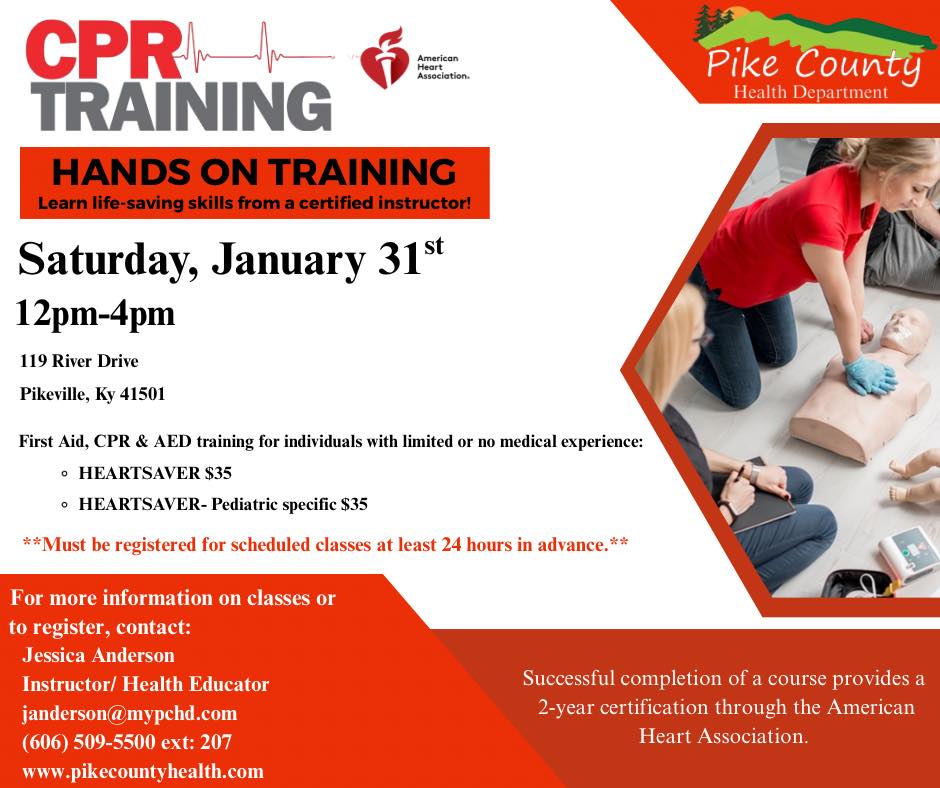 CPR training gives you the skills and confidence to respond in an emergency when it matters most. Register for our upcoming CPR classes today.To register, call 606-509-5500 or email Jessica Anderson at janderson@mypchd.com.