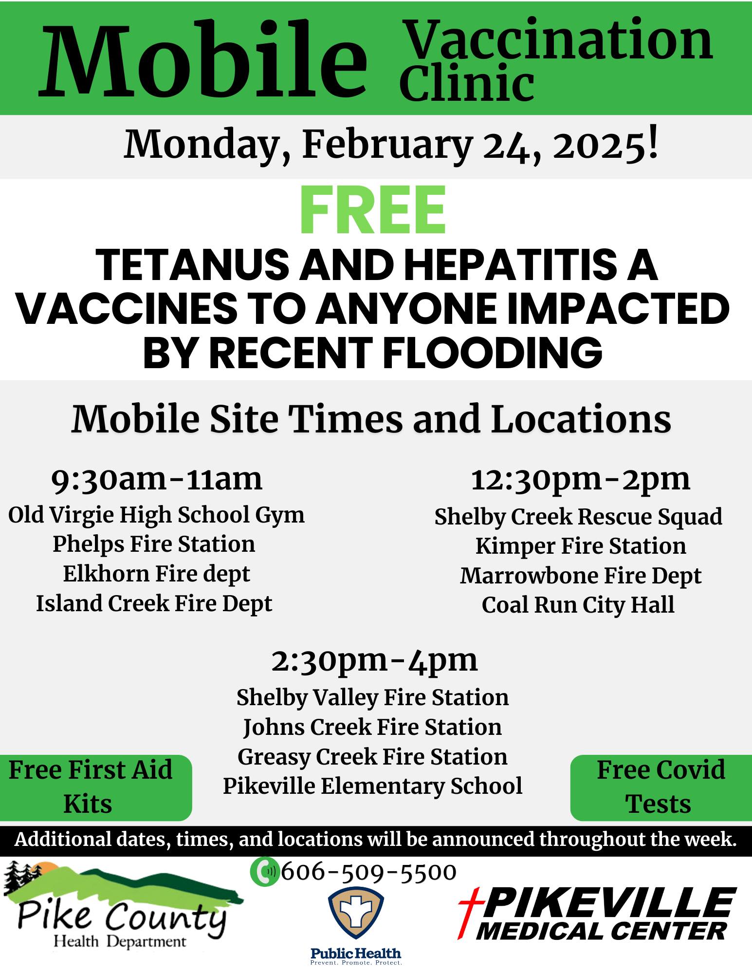 The Pike County Health Department locations, Pikeville and Belfry, will have extended hours through March 7th for vaccination services. Belfry location will also provide services tomorrow, February 27, 2025, from 9:00 am to 4:00 pm.