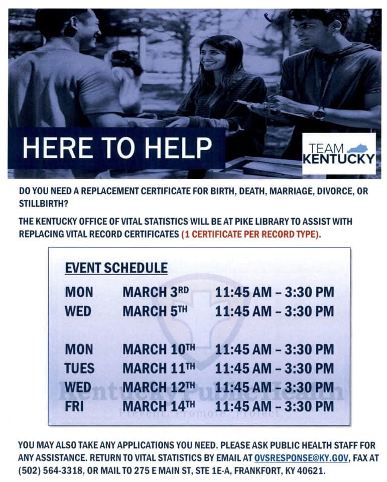 The Office of Vital Statistics will be on site at two of the Disaster Recovery Centers in Pike County starting next week to assist those who lost important identification documents during the flood event. If you have additional questions or … Read More