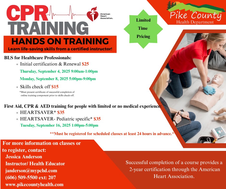 Learn life-saving skills from certified instructors & earn your 2-year certification through the American Heart Association! Call 606-509-5500 for more information.