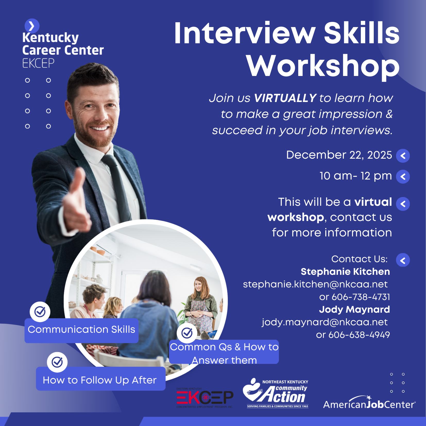 Member Event Spotlight Eastern Kentucky CEP is partnering with Northeast Kentucky Career Center for a FREE Virtual Interview Skills Workshop on December 22nd! Learn essential tips and techniques for successful interviewing, whether you're interviewing in person or online. Don't miss … Read More
