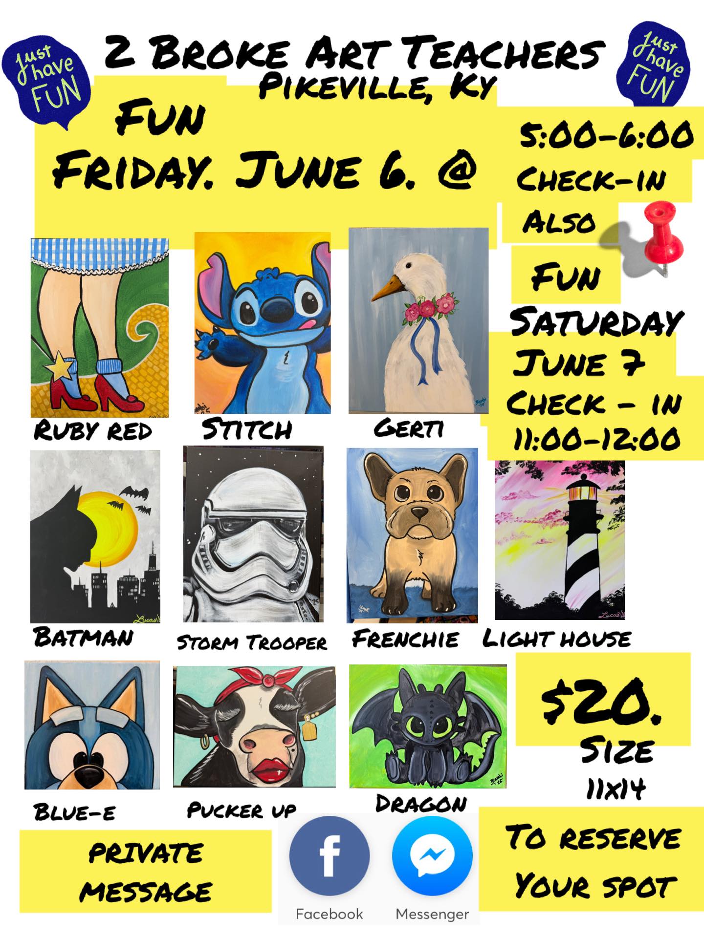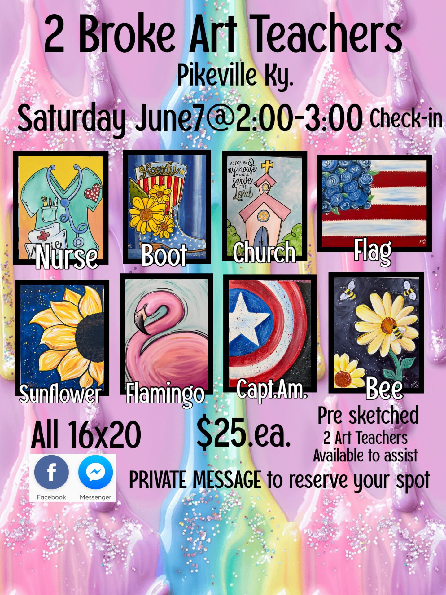 Join us in Pikeville, KY on Saturday June 7th 2025 for “Painters Choice,” check in time will be 2:00-3:00. The 16x20 canvas is available for $25 each . To reserve, please send a private message and include which paintings your … Read More