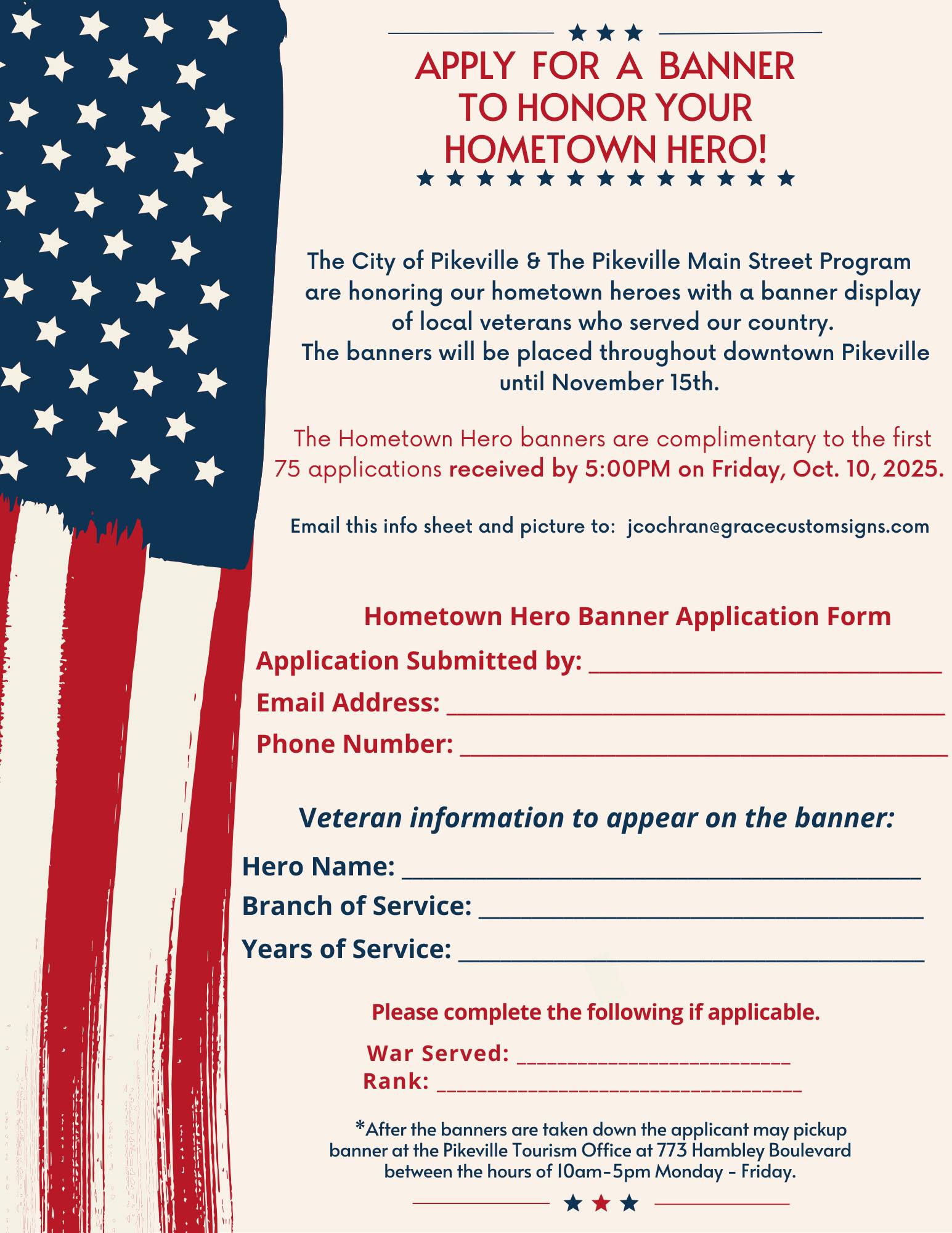 Veterans Day Hometown HERO Banners We’re honored to celebrate our local heroes again this year! We will be accepting only the first 75 applicants who submit a completed form along with a photo of their Veteran. Submit early to ensure your hero is … Read More