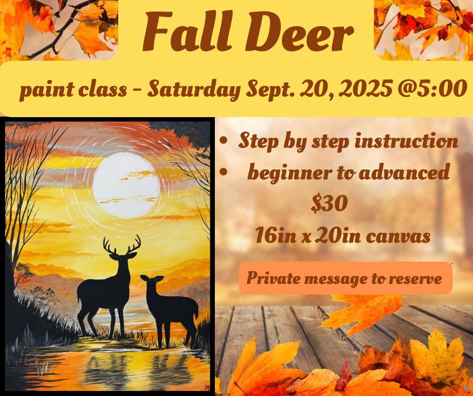 Fall Deer Paint Class Saturday, September 20th at 5:00 PMJoin us for a cozy fall painting session featuring graceful deer—perfect for beginners and seasoned veterans alike! We’ll guide you step-by-step and you’ll leave with a beautiful autumn canvas to show off.$30 … Read More