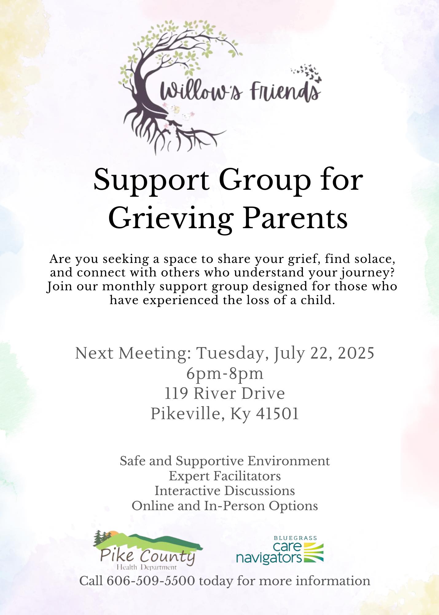Due to scheduling conflicts, Willow’s Friends will hold their July meeting on the fourth Tuesday, July 22nd, from 6:00 p.m. to 8:00 p.m. Virtual options are available. Please call 606-509-5500 for more information.