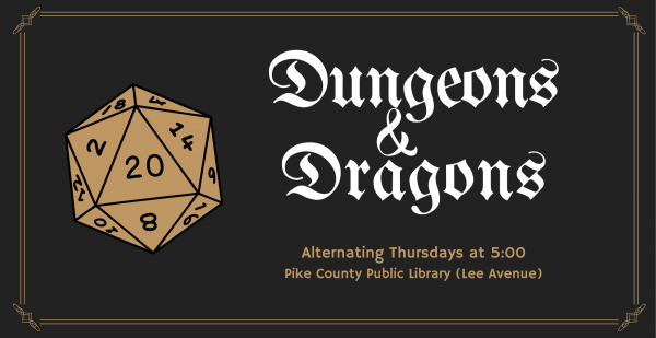 Dungeons and Dragons Group meets every other Thursday at 5:00 at the Pike County Public Library (Lee Avenue). Beginners and experienced players alike are welcome.   Dungeons and Dragons is a role playing game (RPG) where a single player plays … Read More