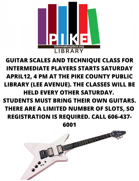 Beginner guitar lessons for patrons ages 18+. This class meets weekly on Tuesdays at 5:00. Please bring your own instrument. Registration required. Call the library at 606-437-6001 to check availability.