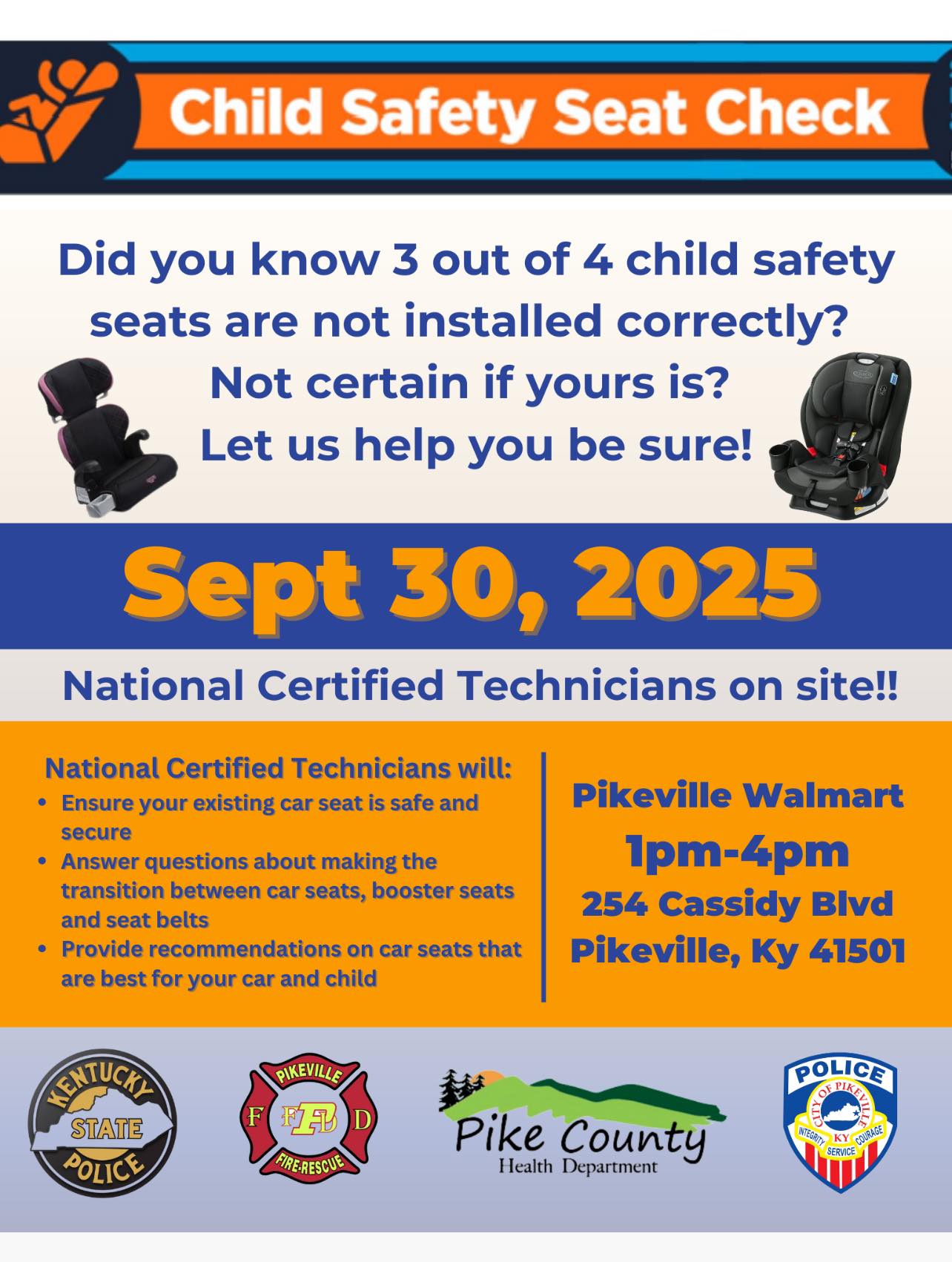 Certified technicians will be on-site to inspect your car seat, ensure it’s installed properly, and answer any safety questions — for FREE!l