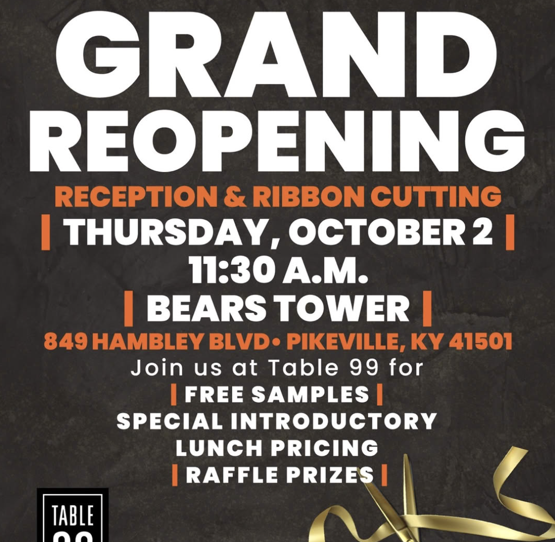 Table 99 is BACK! Come celebrate with us at the Grand Reopening + Ribbon Cutting Thursday, Oct. 2 11:30 AM | Bears Tower Free samples Special lunch deals Raffle prizes Bring your friends, grab some food, and help us cut … Read More