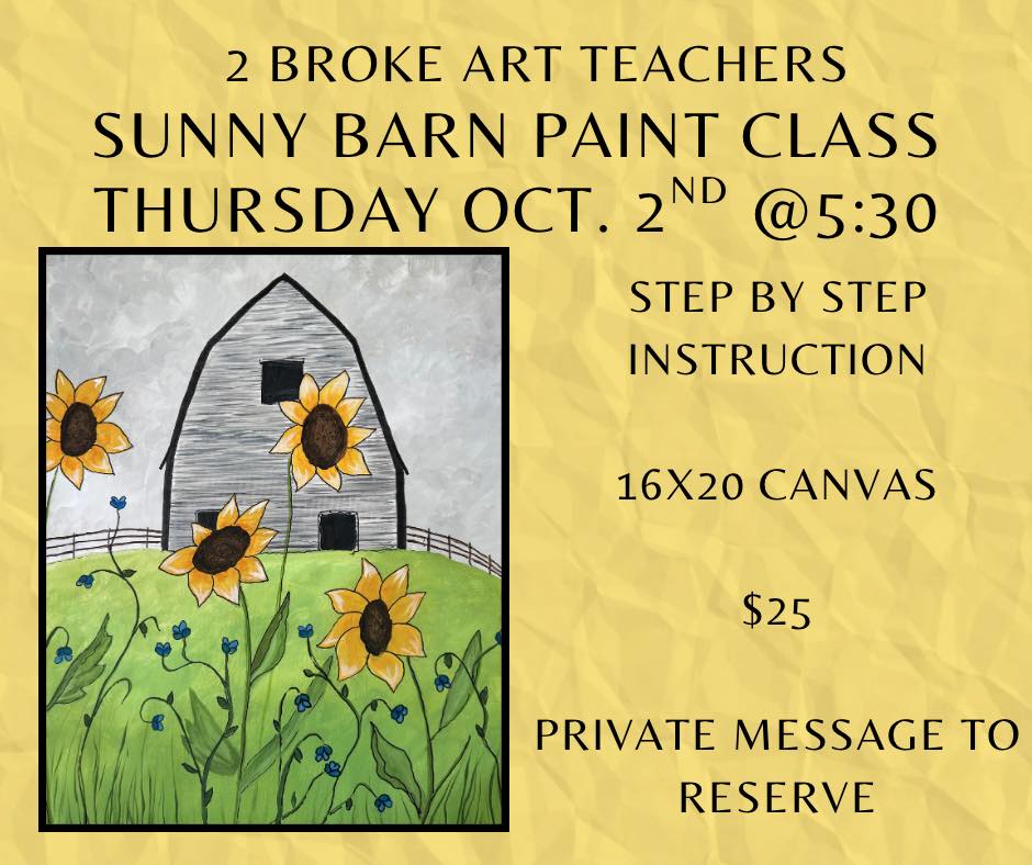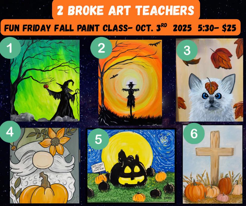 Fun Friday Paint Night! Oct. 3rd at 5:30Join us this Friday for a 16x20 canvas painting class – no experience needed!  2 Broke Art Teachers Studio $25 per painter Private message us to reserve your spot – seating is limited! Help us spread the … Read More