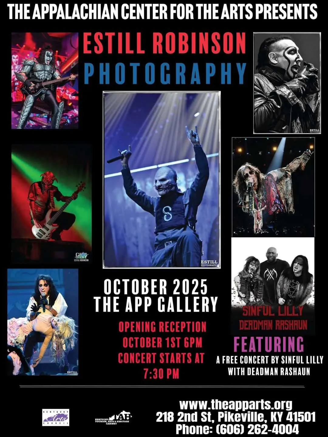The Appalachian Center for the Arts will be hosting Estill Robinson’s last photography exhibit of 2025. Opening Reception is on October 1st at 6pm. A free concert will be performed by Sinful Lilly with Deadman Rashaun on opening night. Concert is for ages 18+.