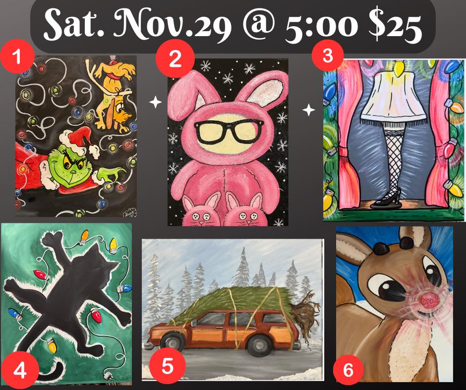 Saturday, Nov. 29 @ 5:00 • $25 Pick YOUR favorite Christmas movie theme! We’ve packed this class with iconic holiday favorites you know and love. Choose from SIX festive designs: The Grinch A Christmas Story (Pink Bunny Suit!) The Leg … Read More