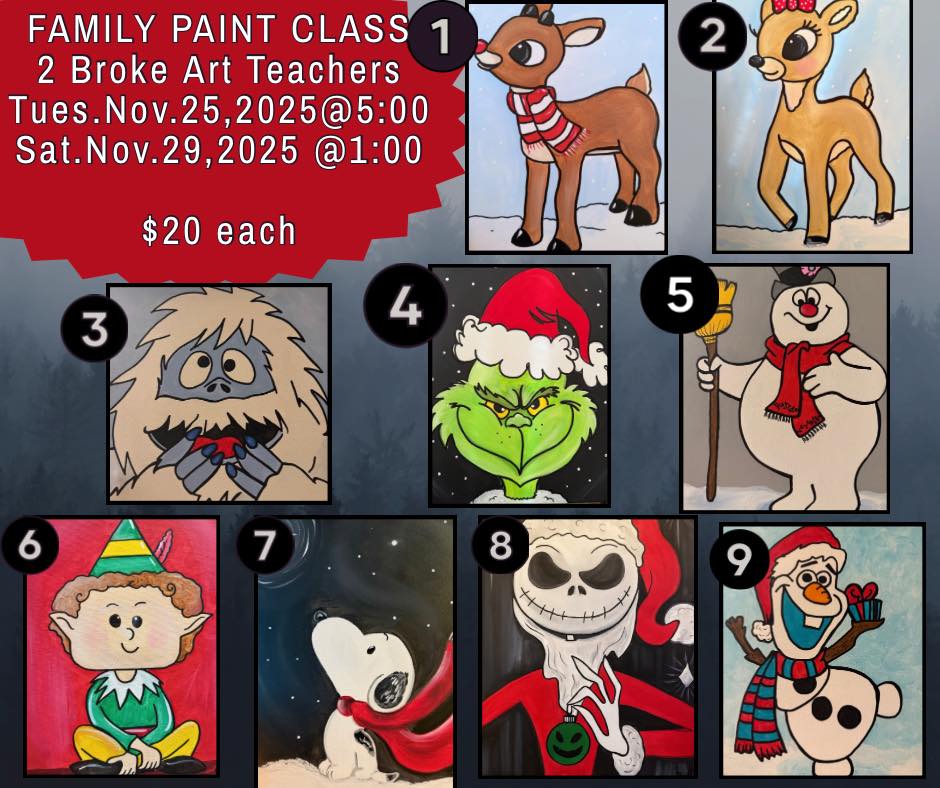We are offering 2 classes to paint these beloved characters to help kick off the Christmas season. No painting experience needed - canvases are pre-drawn. Private message to reserve!