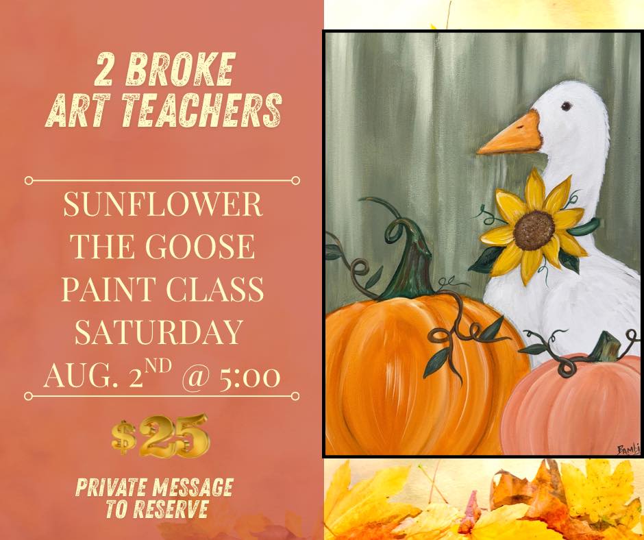 Sunflower the goose is on the loose… join us at 5:00 on Saturday Aug. 2nd for the debut of this cutie of a painting. Step by step instruction will be provided. $25 Private message to reserve . 2 Broke Art … Read More