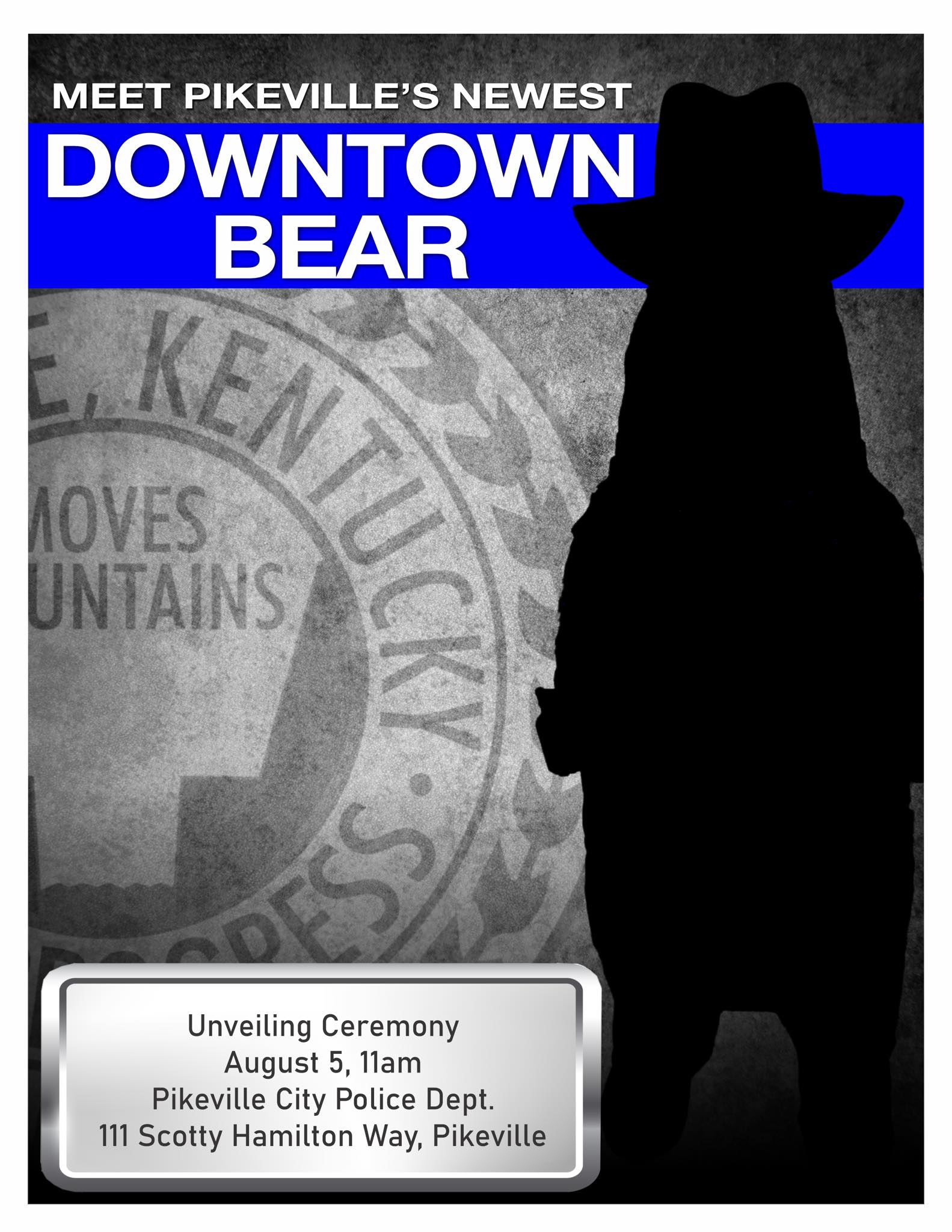 Exciting News, Pikeville! Join us for the unveiling of Pikeville’s newest DOWNTOWN BEAR! **Tuesday, August 5th, at 11 AM**! Location: Pikeville Police Department Address: 111 Scotty Hamilton Way See you there! #pikevillemainstreet #downtownpikeville #visitpikeville #PikevilleBear #BearUnveiling