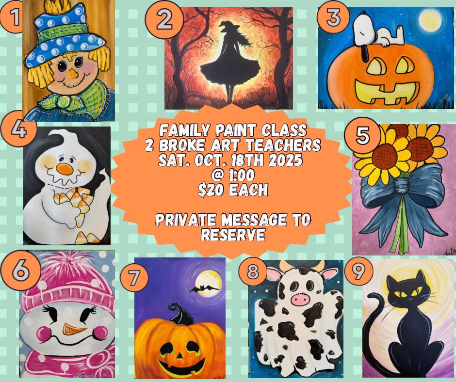 Family Paint Saturday is back!Join us Saturday, Oct. 18 at 1:00 PM for brand-new seasonal designs—perfect for all ages and skill levels. Bring the kids, grandparents, and your creativity! Private message to reserve your seats. Limited spots!
