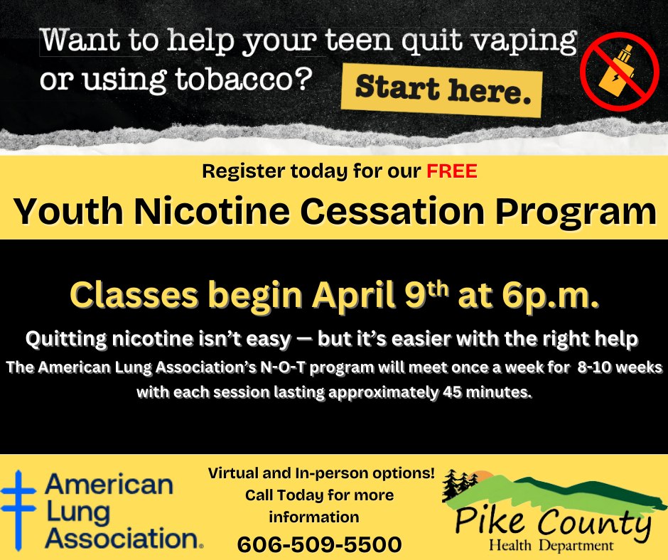 If you have a teen who needs help quitting smoking or vaping, we’re here to support them! Now offering youth vaping cessation classes at the Pike County Health Department. Classes begin April 9th at 6:00 p.m. Call 606-509-5500 and ask … Read More