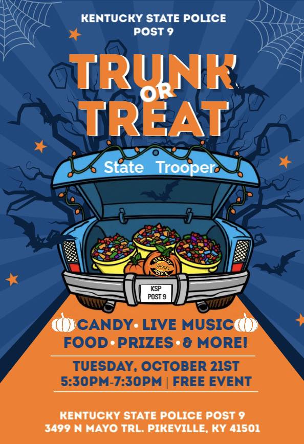 Kentucky State Police Post 9 invites you to our Trunk or Treat! Bring the whole family out for a safe and fun Halloween event filled with: Candy Live Music Prizes & More! Tuesday, October 21st 5:30 PM – 7:30 PM … Read More