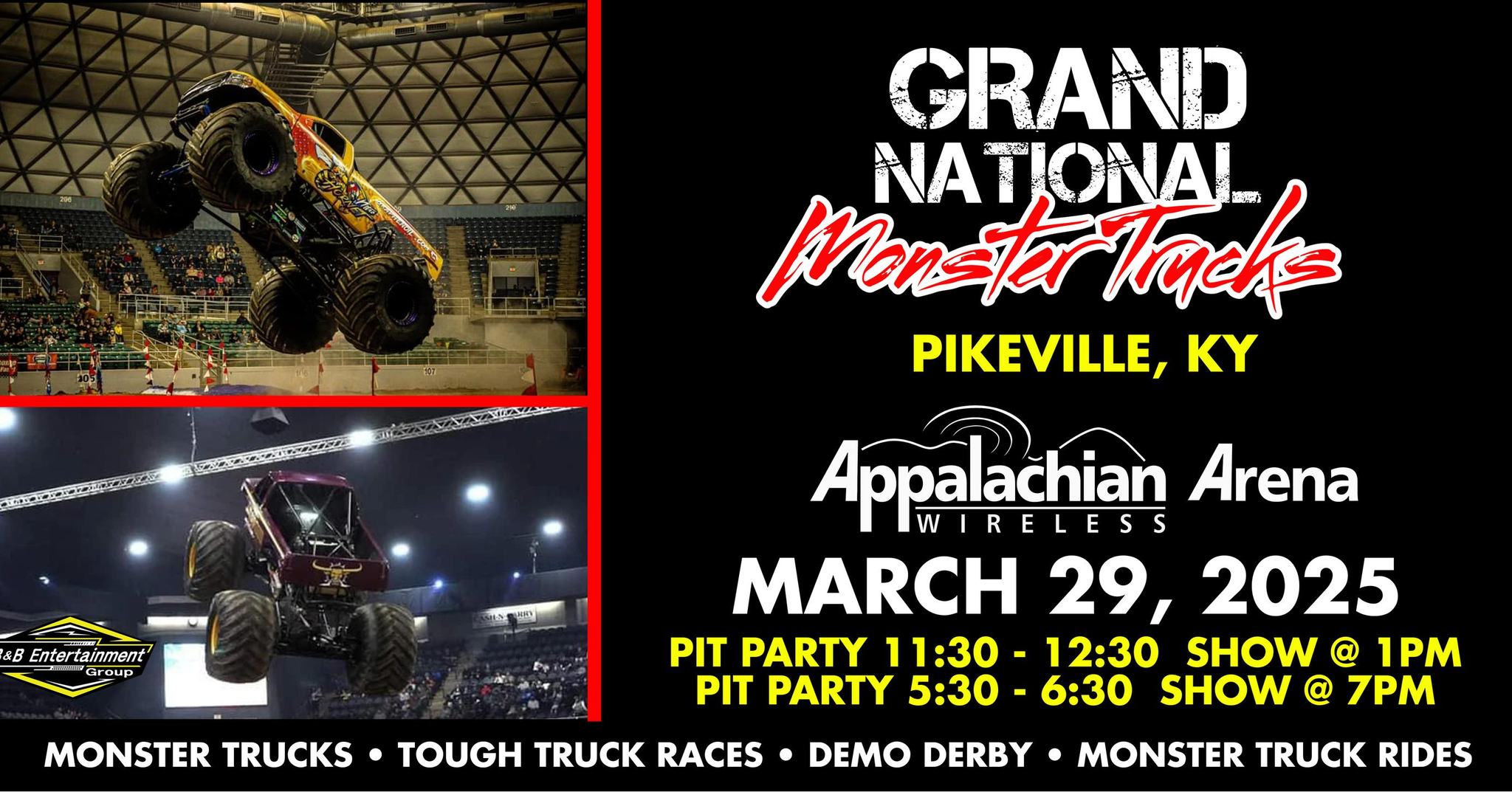 Grand National Monster Trucks March 29, 2025 1pm show 7pm show Appalachian Wireless Arena Pikeville, Ky 1pm show Pit party 11:30-12:30 7pm show Pit party 5:30-6:30 VIP $38 (everyone) prices Kids lower part of upper arena $23 Upper arena $18 … Read More