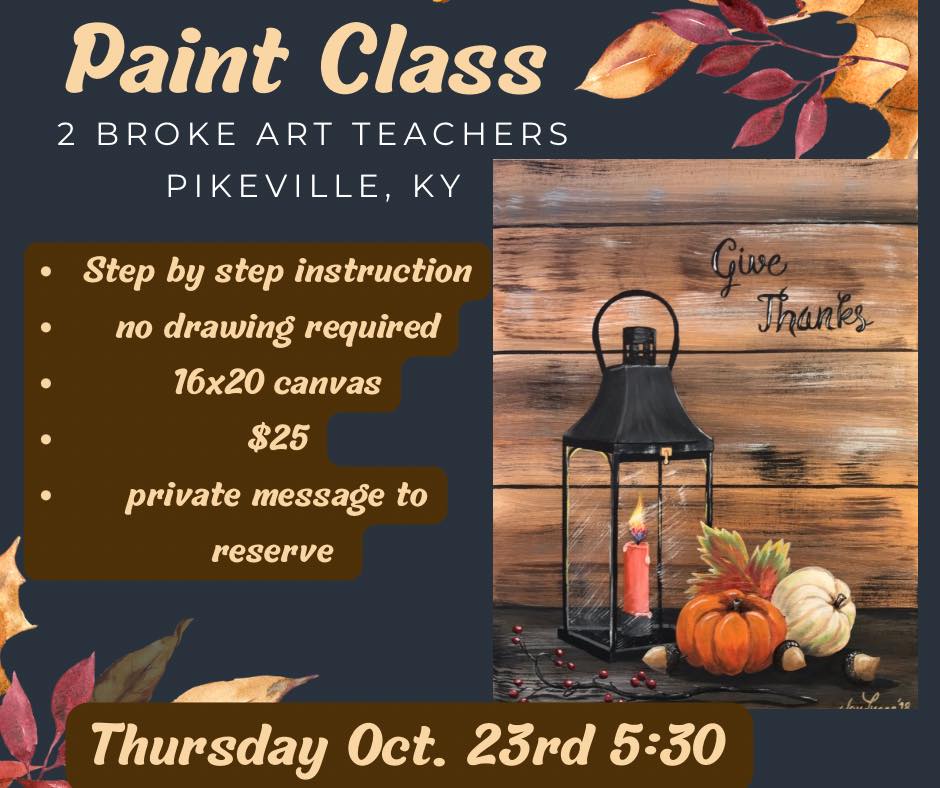 Pikeville, Kentucky and surrounding areas ….2 nights 6 great paint choices. Friday Oct. 24th @ 5:30 and Saturday Oct. 25th @4:00. Come join us for a fun and festive paint night.$25 per canvas(16x20)Private message to reserve your seat.2 Broke Art … Read More